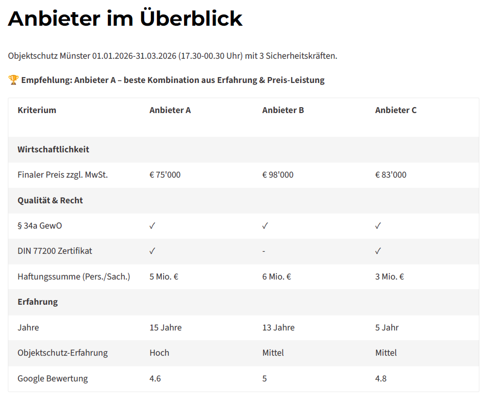 Erhalten Sie eine strukturierte Gegenüberstellung von bis zu 3 passgenauen Anbietern.